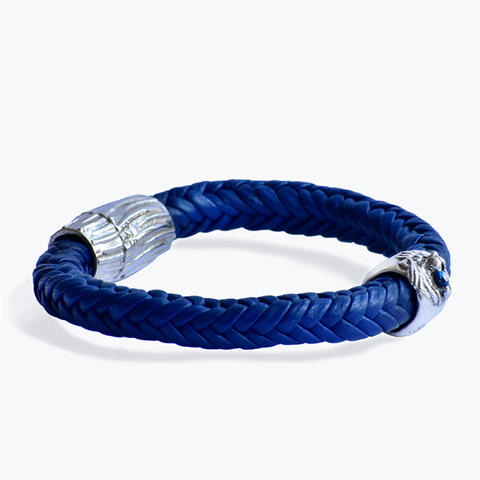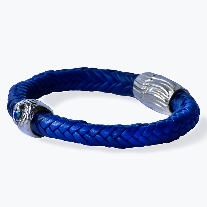 Represents versatility, strength and power. Features a lion head and a faceted sapphire. Bracelet in king blue; leather braided with 12 double leather strands and a secure magnet clasp, with detailing that shows the fur. Has all the elegance of pure and clean Mexican Sterling Silver. 1.5 in diameter (contact us to order your size).
