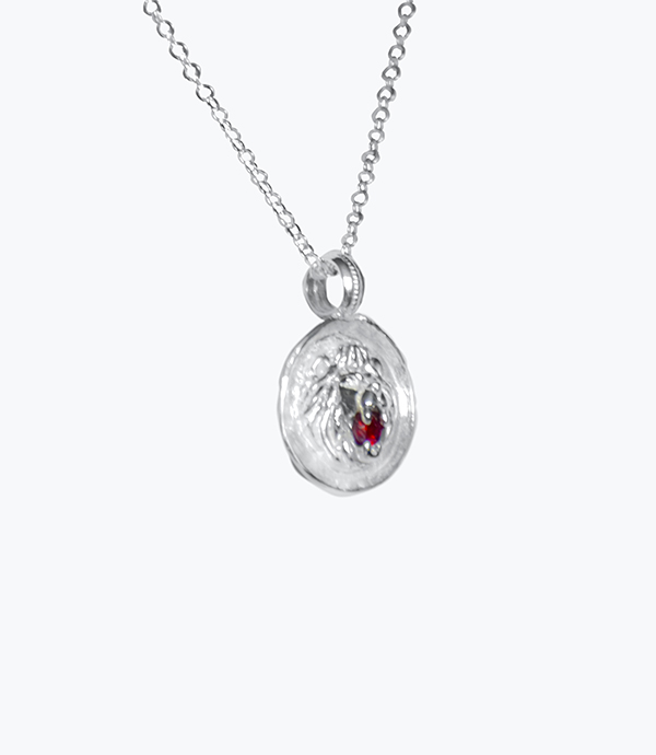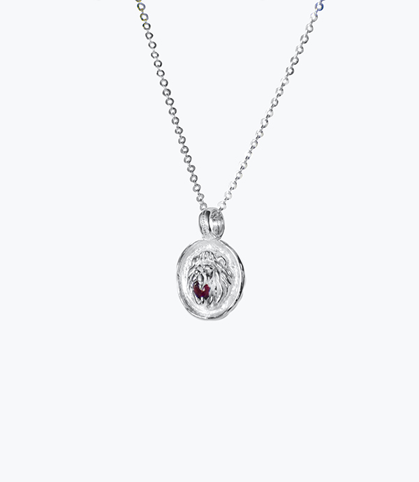 Represents a positive vision of yourself, full of confidence and in your personal power. Necklace with a lion charm and a garnet on the snout originally mounted on its fangs and representing a moment where it stands up to its opponent. 925 Sterling silver.