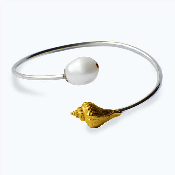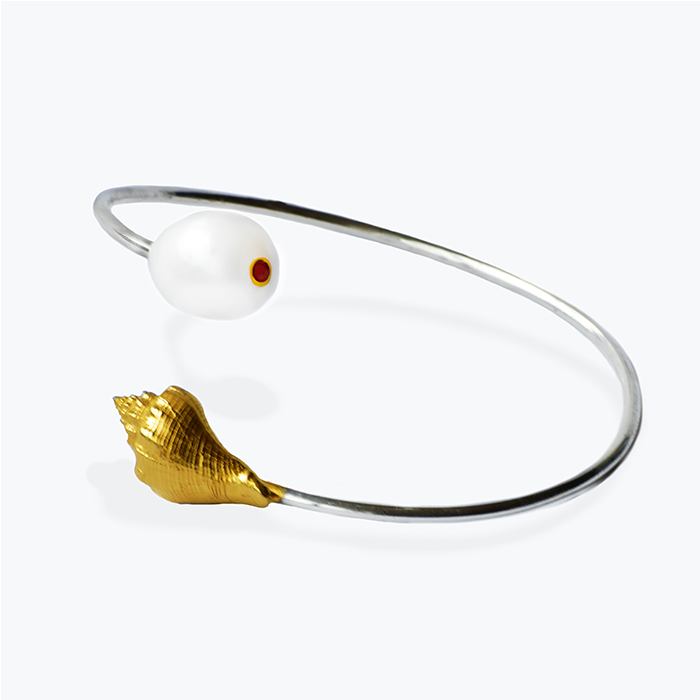 An adjustable bangle in 925 sterling silver; moldable to your wrist, arm or forearm. The Vermeil snail, and a Pearl with ruby at the tip, are a complement to the Nymph. You can choose the stone mounted on the pearl.