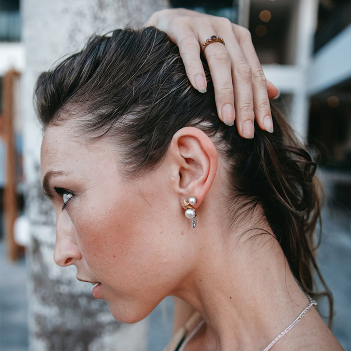 We write in the sand for the sea to take it to a star and return it to us like a melody. Earrings that span your earlobe, and if you do not have two orifices, it is ideal. Vermeil star with two 2 gray pearls and 3 onyx with grain setting in 925 silver.
