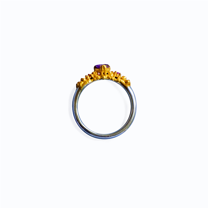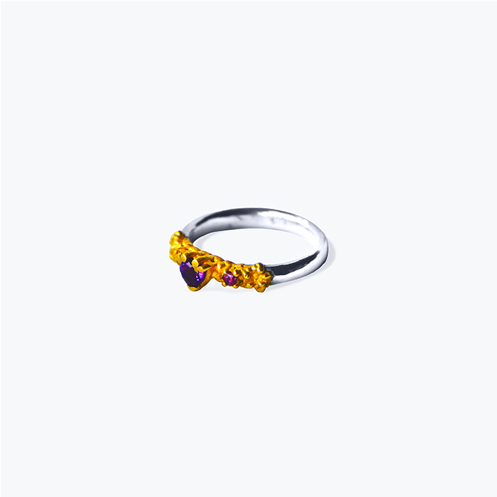 Amethyst heart (2 amethyst) 2 rubies, side tropical flowers in 925 silver, only the front is 18k plated